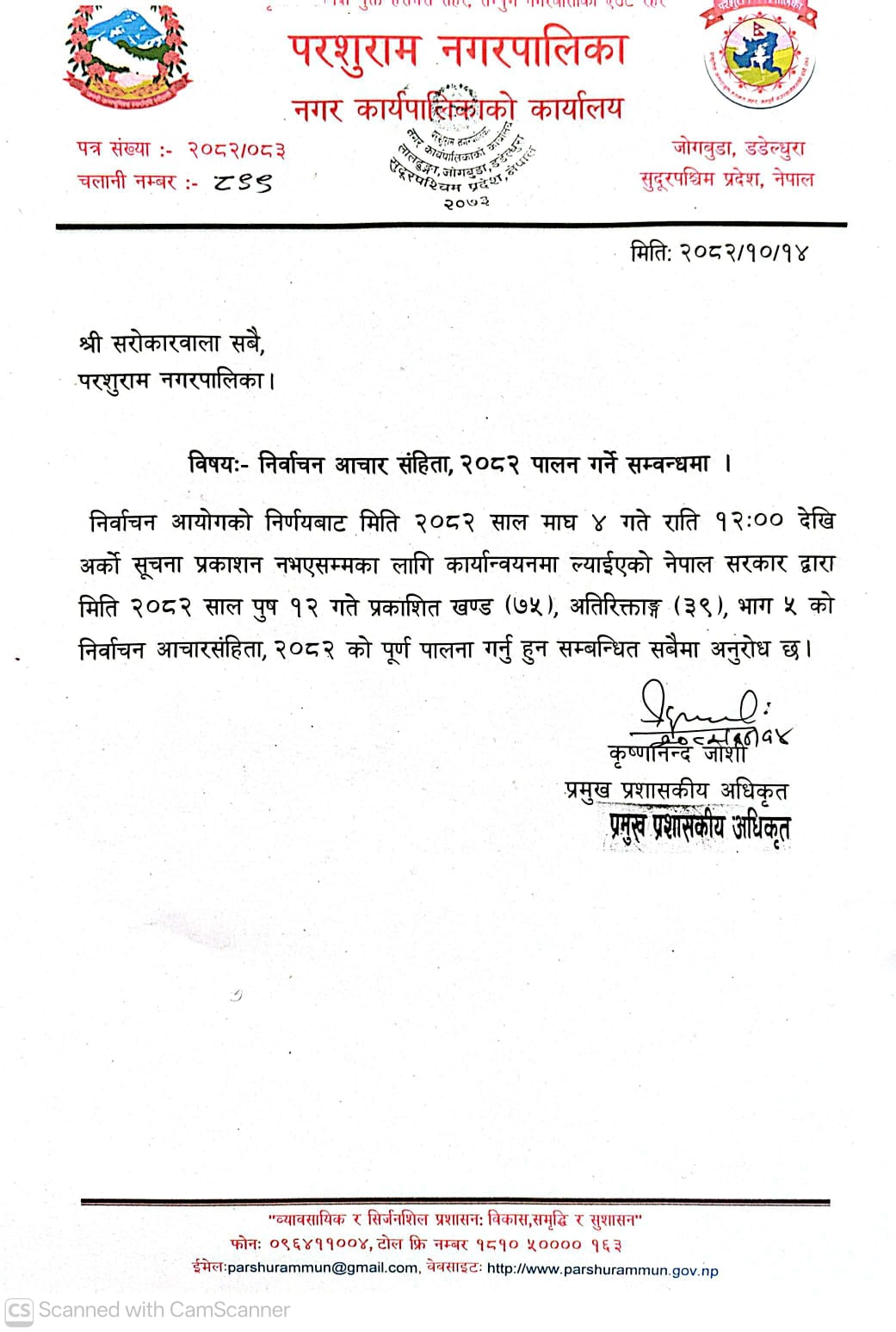 निर्वाचन आचार संहिता पालना गर्ने सम्बन्धमा ।