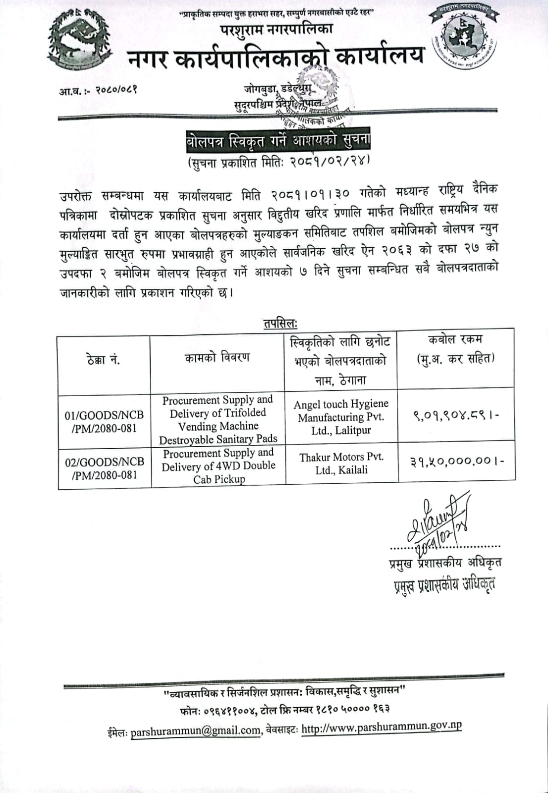 बोलपत्र स्विकृत गर्ने आशयको सुचना ।