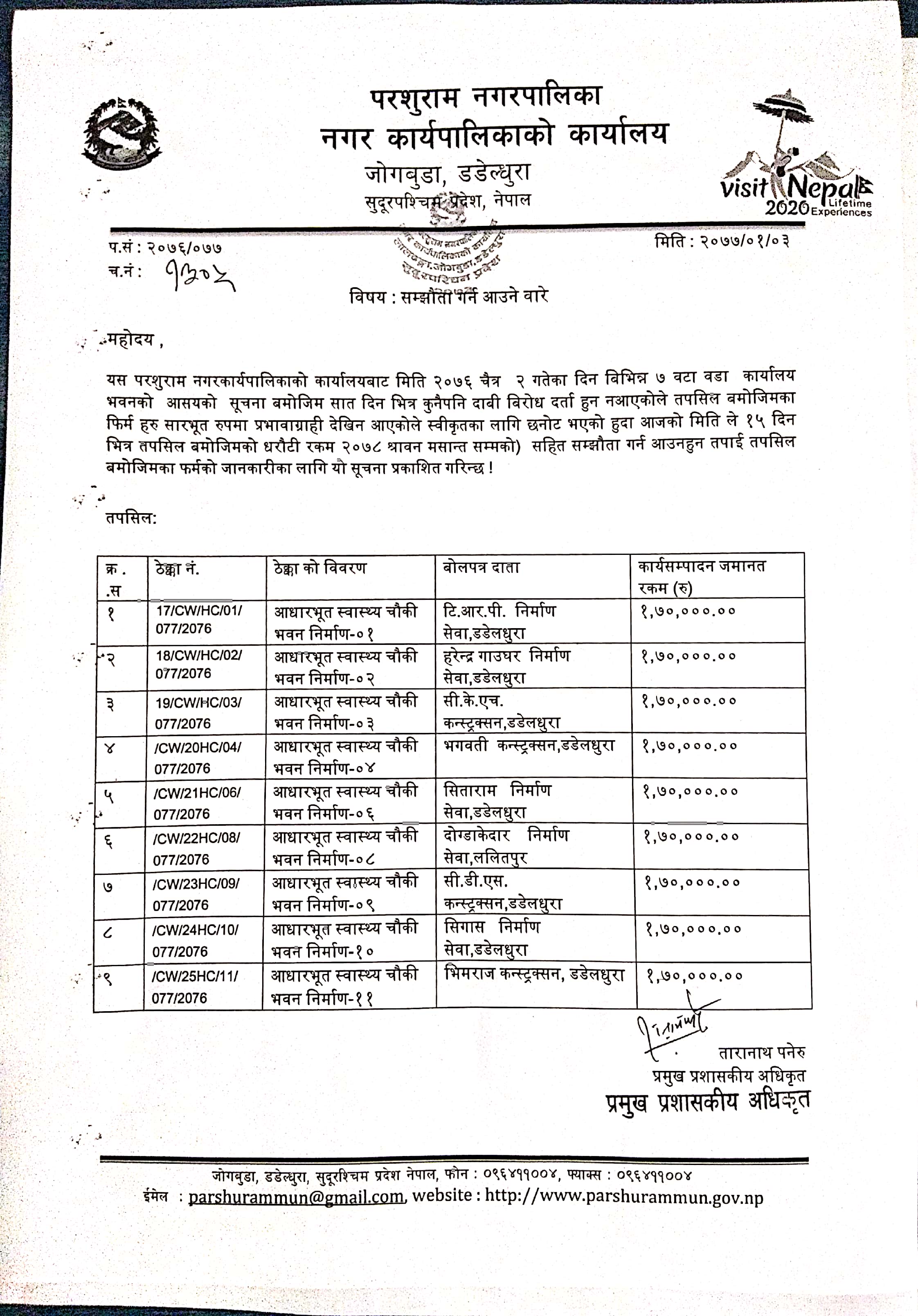 बोलपत्र स्विकृत गर्ने आशयको सुचना ।